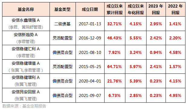 三、团队实力深厚 除了安信永鑫增强债券,安信基金旗下混合投资策略的产品业绩做得都不错。 安信稳健增利混合A、安信新趋势混合A、安信稳健增值混合A等在2022年、2023年都是正收益。 不仅仅是2022年、2023年,像安信新趋势混合A$安信新趋势混合A$ 连续7年正回报,安信稳健增值A$安信稳健增值混合A$ 连续8年正回报,历史每个完整年度都是正回报。 股债混合策略产品的管理一直是安信基金的强项,混合资产投资部由张翼飞、李君领衔,团队依据风险收益比与产品定位,精选纯债、转债、股票三大资产进行组合,实现以简驭繁。 此外,安信基金投研、风控、交易等对该团队全力支持。 研究部多年来保持25至30人的配备,覆盖A股全部大类行业,重点行业多人覆盖; 固定收益研究部7人左右,主要从事个券的信用研究工作; 交易团队对资产交易的支持; 风控团队对组合回撤的监控与定期业绩分析等。 全方位的协助互助,强强联合为投资者提供稳健的产品,这也是为啥安信永鑫增强逆势仍能增长的实力所在。 2024年,李君极具韧性和注重客户体验的低波动投资策略,也依然值得我们期待。 风险提示#A股惊现深V反转,这次真的是底部吗?# 市场有风险,投资须谨慎,基金投资不保证本金不受损失,不保证一定盈利,投资需谨慎。以上观点仅代表作者个人意见,不代表基金公司立场,也不构成对阅读者的投资建议。文章内容仅供研究和学习使用,所涉及的股票、基金等均不构成任何投资建议。