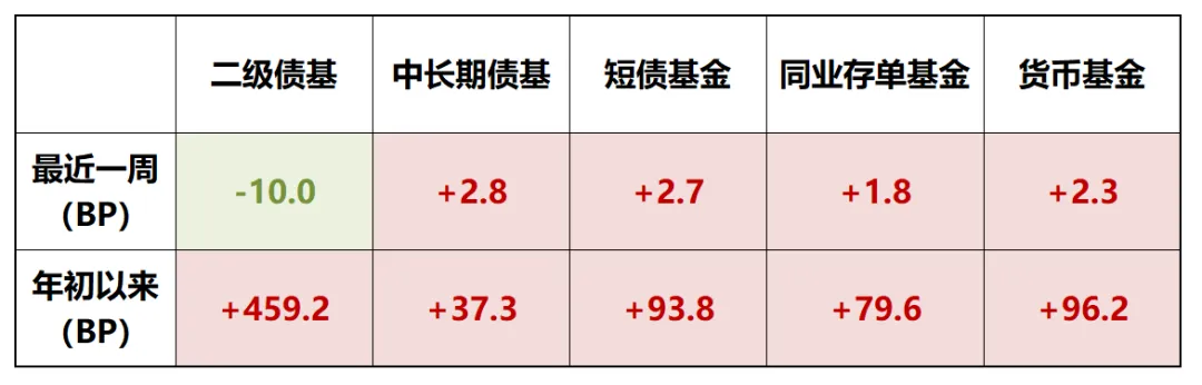 注:数据来源于Wind,口径截至2025/9/21。其中二级债基、中长期债基、短债基金、同业存单基金、货币基金分别对应万得混合债券型二级基金指数(885007.WI)、万得中长期纯债型基金指数(885008.WI)、万得短期纯债型基金指数(885062.WI)、万得同业存单基金指数(885045.WI)、万得货币市场基金指数(885009.WI)。债券利率上行,对应着债券价格下跌,意味着固收类产品的净值趋于震荡或下滑,投资收益下降。反之,债券利率下行,对应着债券价格上涨,意味着固收类产品净值上行,投资收益上升。基金净值上涨1BP=上涨0.01%。