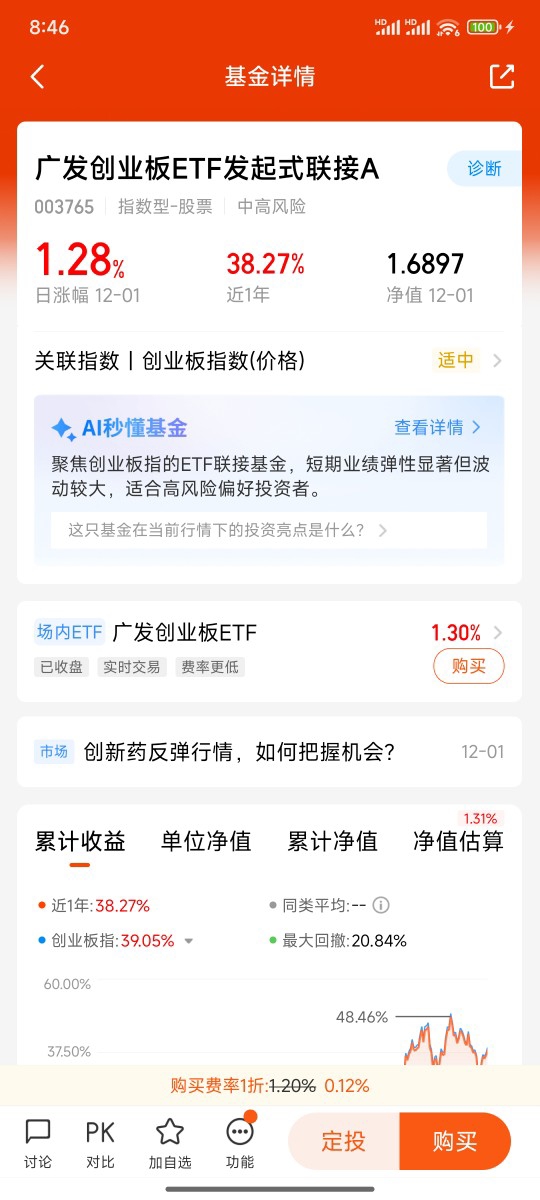 谁说12月份没行情的,创业板今天发挥依旧坚挺啊,这只ETF紧密跟踪也是带我吃到了,很好!