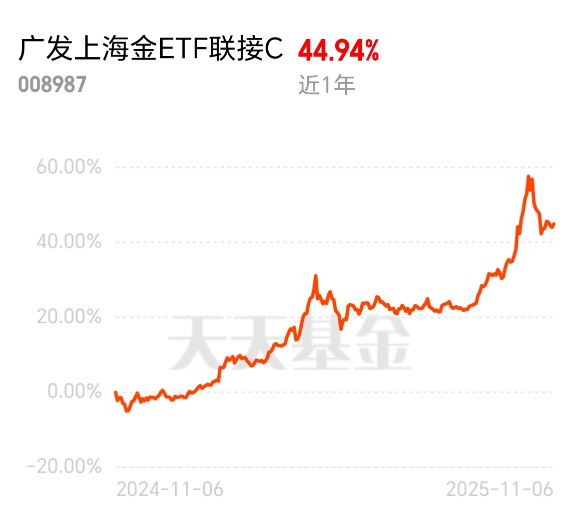 黄金就不是短期行情,这不就尾盘拉红!$广发上海金ETF联接C$ 好歹手上的一年涨了44.94%呢