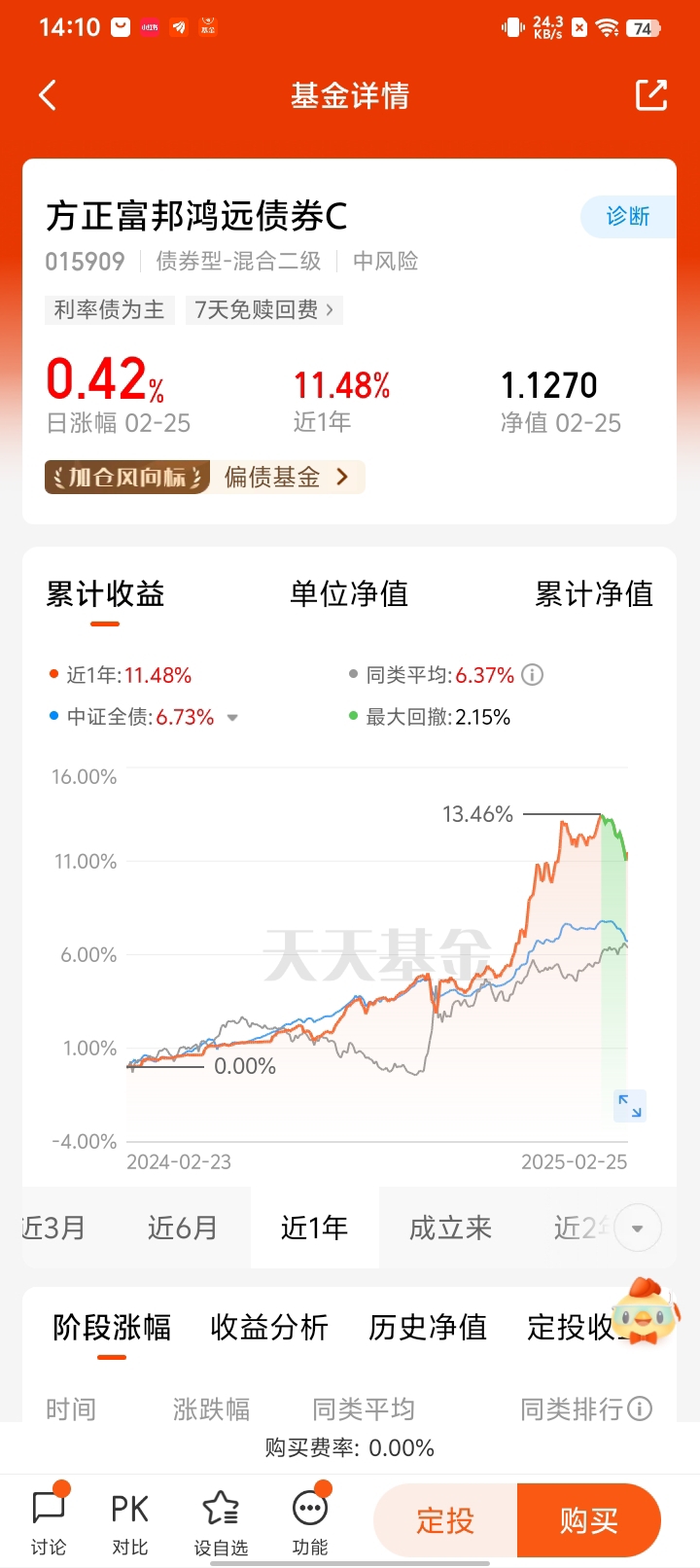 如果是追求稳健的投资者,可以选择不投转债和股票的纯债基金进行配置。其实,方正富邦睿利纯债C是这样一只低调的赚钱“实力派”。方正富邦睿利纯债C作为一支纯债型基金,近一年收益5.65%,同类基金排名前2%;这也就意味着在权益市场表现不佳时,方正富邦睿利纯债C可以远离股市震荡,几乎不会受到来自权益市场的负面影响,非常适合长期持有和底仓配置。
