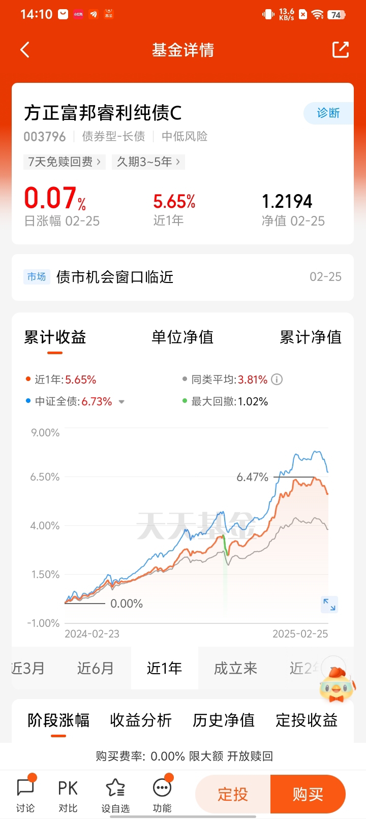 长期来看,纯债基金的走势十分稳健,而权益市场以及转债基金的表现则相对来说比较波动,所以纯债基金更加适合长期持有,方正富邦睿利纯债C作为稳健投资实力派,不需要大家频繁地进行择时,且净值子成立来非常稳健,我认为是作为资产配置压舱石的佳选。@方正富邦基金