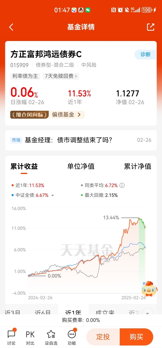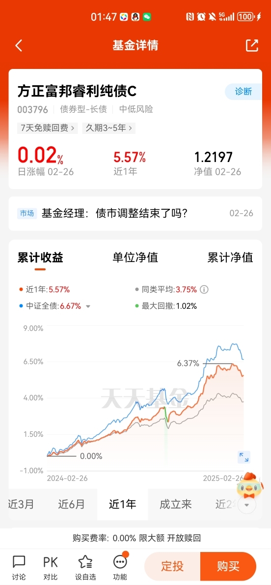 打卡第16天$方正富邦睿利纯债C$作为一只专注债券市场的纯债基金,其核心优势体现