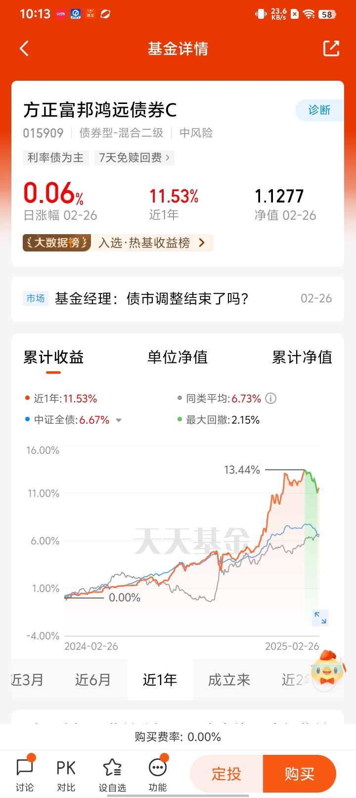 以方正富邦睿利纯债C为例,仅投资于债券,不投资于股票、权证等权益类资产,主要凭借基金投资债券的利息收入和买卖债券获得的价差收入保持平稳收益,风险较低,能够经受住市场考验。截至2月26日,该基金近1年收益率达到5.57%,高居同类前5%,远超同类均值。