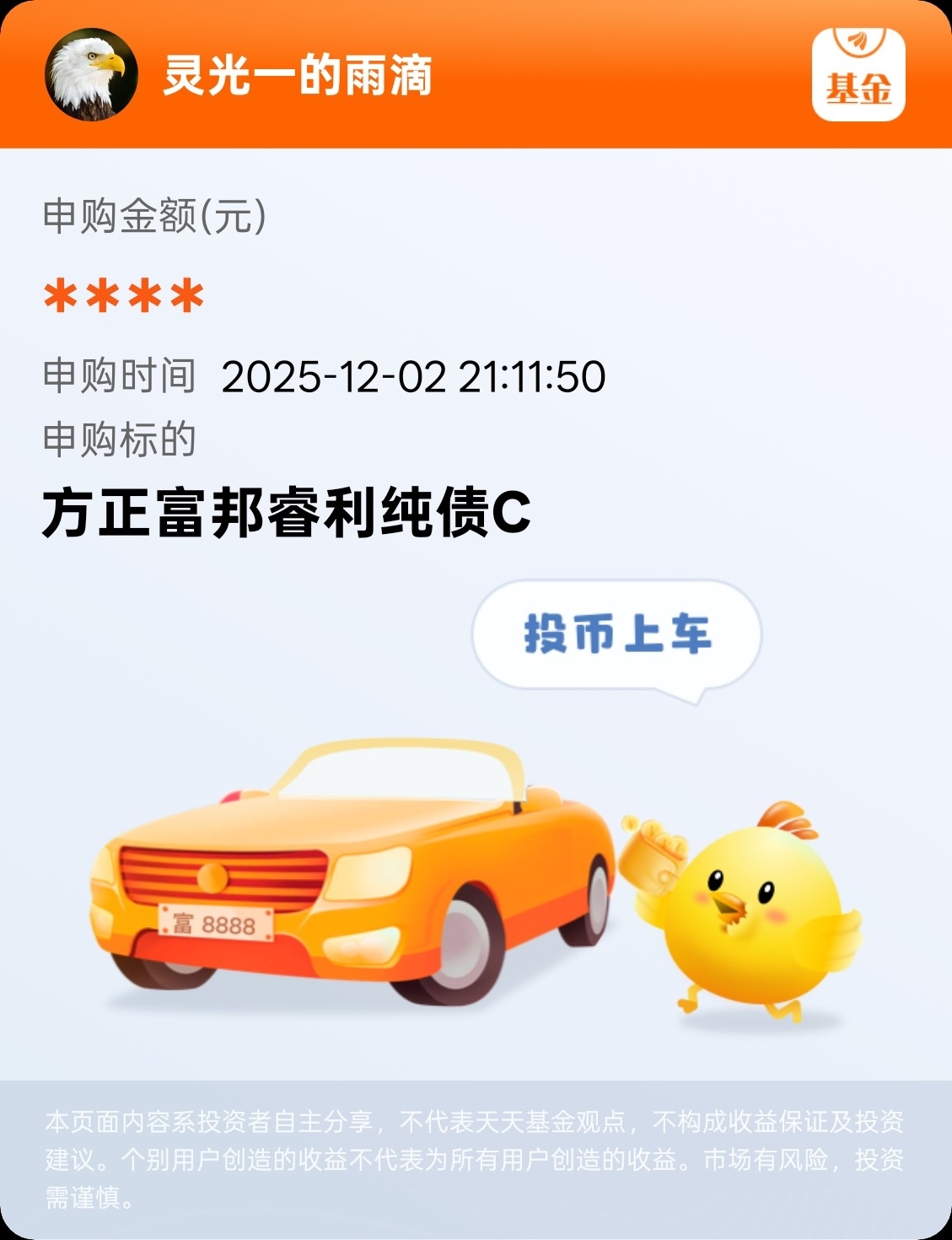 这基成立以来每年都是正收益,债基就是玩的长期,继续加仓,慢慢收蛋吧。$方正富邦睿