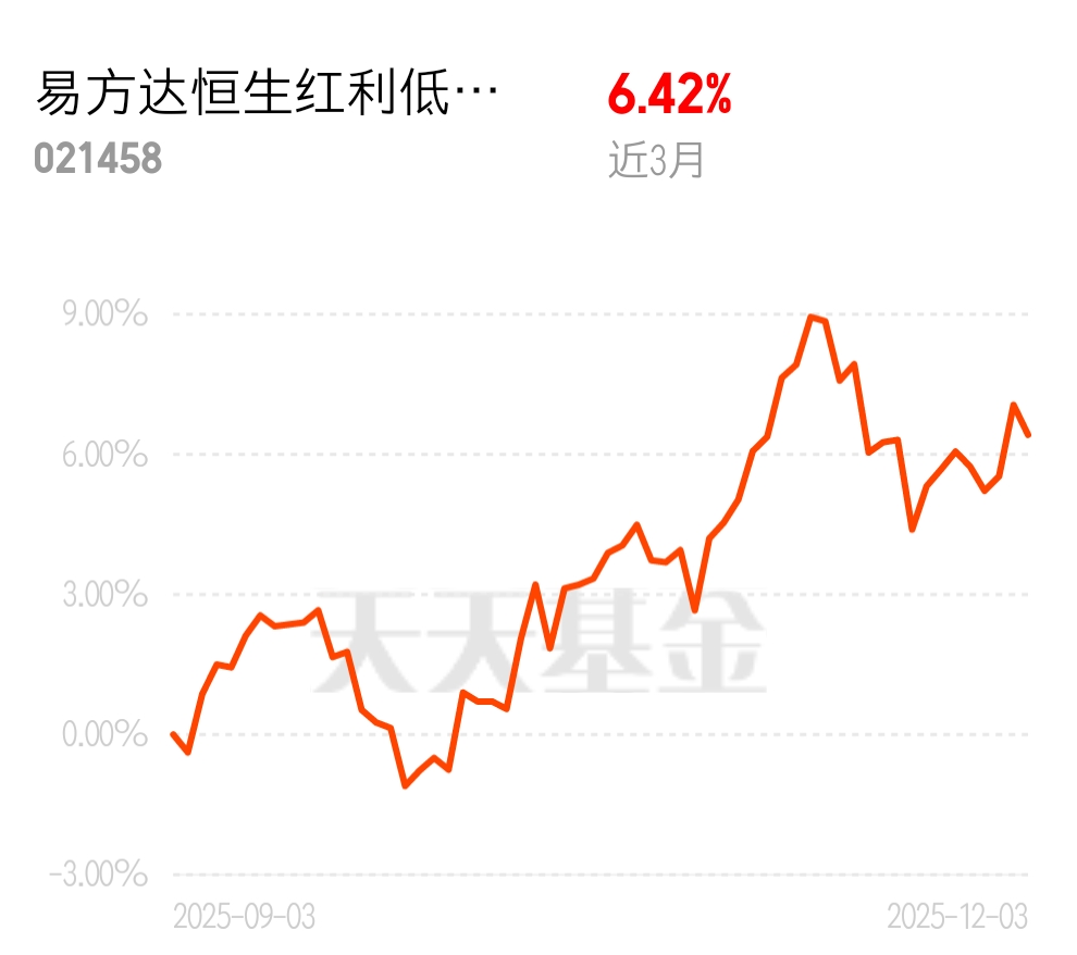 现在很多人从高波动的成长股里出来,转头投向稳健的红利低波板块。易方达恒生红利低波 ETF 联接 C 近 3 个月 6.42%,波动小回报稳,是资产配置的好选择。 $易方达恒生红利低波ETF联接C$