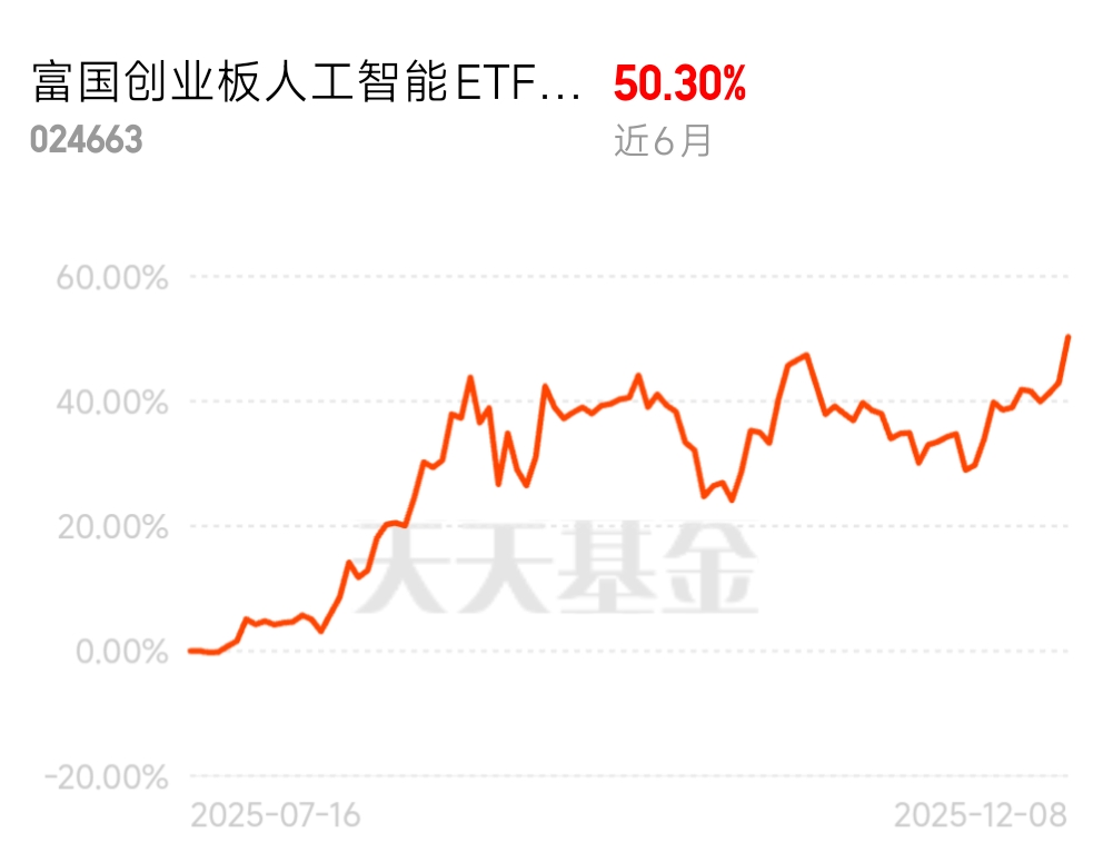 眼下华夏能源革新A热度高,这边也配了点富国创业板人工智能ETF联接C,连涨3日,近1周6%、1个月8%、3个月16%、6个月50%,各阶段都跑赢同类,AI板块里绩效挺能打。