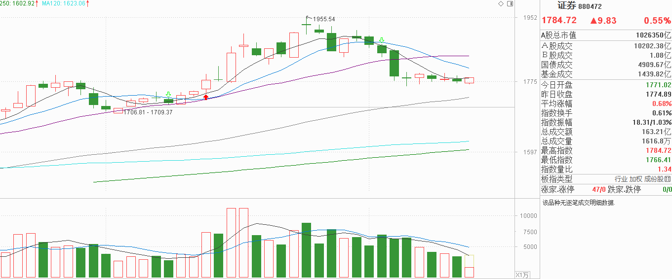 家人们,证券这周是闹得够呛! 并没有选方向,就在5天线附近波动,由于横盘前证券出现了一根大阴线击穿5天线和20天线,是资金流出的主要信号,现在没有方向的波动我认为是资金流出后没有任何资金流入的表现。要知道证券在7月24号中阳线后构建了一个小箱顶,现在证券的震荡位置就在这个已突破的小箱顶上方,算是区间箱体震荡获得支撑。昨天说了,证券这种走法是不对的,必须出现中阳线重启才能重新走好,还这样横盘下去,随着成交量慢慢减少,证券板块的上涨逻辑就会被证伪,久盘必跌的魔咒就会产生。别看证券近一周好像人畜无害,真走弱再出中阴就会再下一个平台,这个风险得提防,当下并不是加仓的好机会。