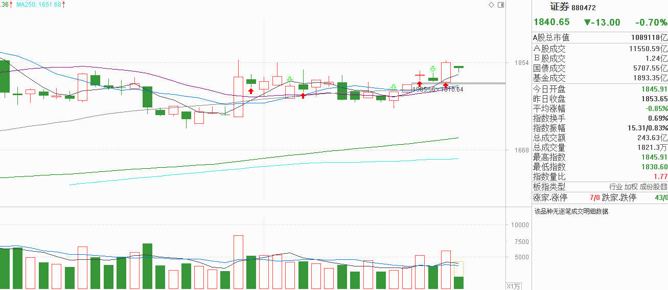 我的天呐!老铁们!证券最近这是闹哪样啊!昨天低开高走中阳反弹,重新回到9月29号上影线附近,但并没有突破,做多力度与29号相比也是偏弱,虽然资金是流入的,但持续性未知,必须从今天的走势中确认。今天证券没有继续上行,反过来低开低走,基本确认证券依旧是箱体震荡,昨天回到箱顶附近,当然会吸引资金流出止盈。暂时看5天线是否出现支撑,毕竟昨天证券的异动发生在午盘前后,主力偏向拉尾盘这主。如果今天主力全天不作为,我可以认为证券本次反弹已经结束,大概率会回到20天线附近再组织新的震荡平台。说白了,就算看对了节奏,证券板块的上涨空间也就这么多,把握不好很容易会做反方向,导致不必要的烦恼。证券真能出现持续的资金流入,才是它走强的关键所在,一日游的话就不可信。