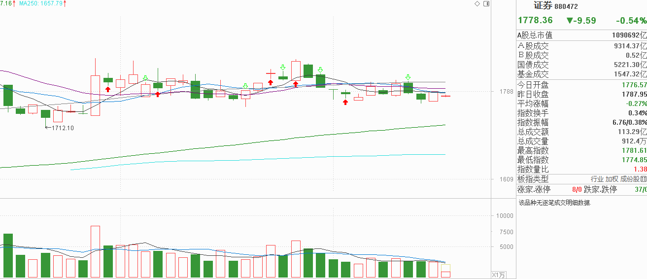 证券的朋友们,都给我听好了!昨天低开高走把周三的小阴线反包,5天线也刚好收复,但今天还是低开在5天线下方震荡,起码没有持续性。再说证券自9月29号大阳线后一直围绕在很窄幅的区间内波动,完全没有趋势,上涨与下跌的概率其实都一样。比如周三回到震荡平台的箱底,昨天就出现反弹,反弹后不属于箱底,今天又还回去了,这种行情即使你能把握,依然在箱体内波动,上涨空间不大。又因为证券在8月见高后持续震荡了三个月,真要离场的资金估计已经跑光了,当下就是平台里的无序波动,只要不能站上5天线并持续反弹,把证券的震荡看成心电图也可以的,老手都知道,这种表现是不会有行情的,还是等待新增资金持续有力度的流入吧。