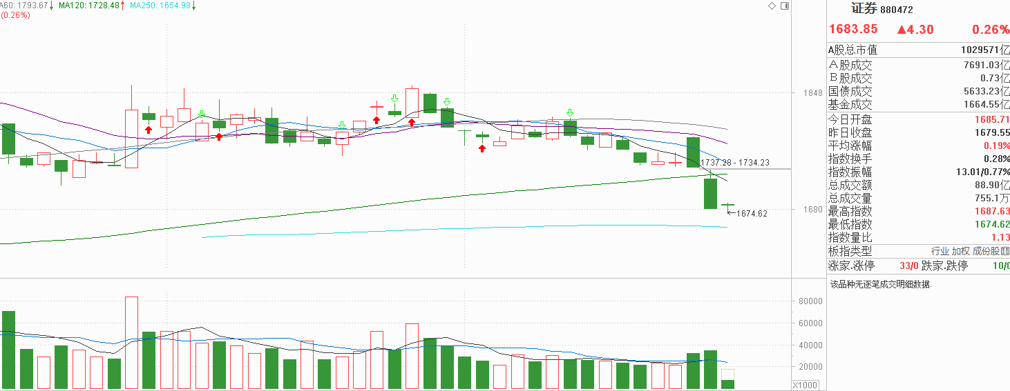 证券上周五低开后一度上行站回半年线,但上周四高开低走中阴线把20天线的阻力确认后,做多资金完全是无心恋战的状态,重新中阴调整继续破位下行,近两天出现连续有力度的中阴调整,当然是资金明确流出的表现,由于证券本来能在9月底点受29号大阳线形成窄幅震荡的箱体,现在两根中阴直接击穿平台向下走,此前震荡平台就成为现在反弹的主要阻力区。今天证券虽然是高开,但未发现资金做多的动力,还是冲高回落至上周五收盘价附近,我认为是正常的表现,当下抛压明确,买盘不足,5天线下穿半年线再构成一个新的技术反弹阻力点,证券向上反抽的空间就很少了,下方还有年线支撑,在没有任何头绪的情况下,我认为还有顺势下探的可能,即证券当下是资金刚刚流出的状态,这个状态还没有被止住,就算做短周期博弈,也应该要确认抛压出清后再看好。