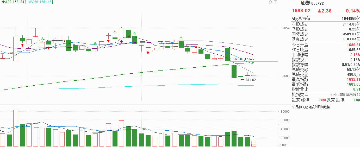 我跟你讲啊!证券昨天昨天一度微阳反弹,但未遇上下移的5天线就主动回撤,结合上周四和周五连续两天有力度的中阴调整,资金流出信号较强,连续两天修复基本没有多头尝试。今天5天线继续下行压制,证券第三天窄幅震荡,依然没有任何积极表现,我觉得更像下跌中继了。别看证券连续三天波动少,实际上没有任何多头在防守,如果上周离场的资金周四、周五继续大幅流出,再复制一次中阴调整也是有概率的。我就看一个指标:真走强要止跌反弹的话,总得收复5天线吧,主力连5天线都不敢碰,你在逗我玩呢?连诱多的成本都不愿意投入,起码我是不会上当了,短周期我看淡证券方面的超跌反弹,这位置的钱只能给主力去赚。