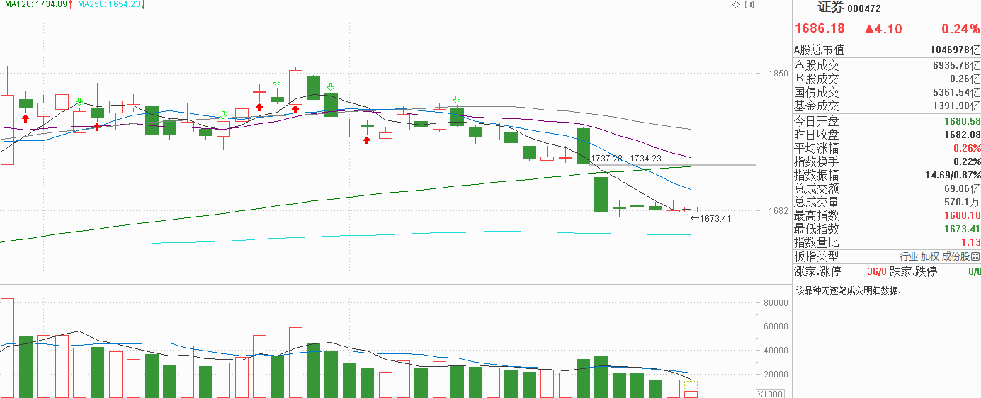 我跟你说啊!证券昨天也曾出现过小阳反弹,一度收复5天线,不过反弹动力很弱,尾盘冲高回落还是回到5天线下方。要知道上周四开始证券出现连续两根中阴回落,资金流出现在很是明显,本周前四天证券只要在上周五中阴线下沿做窄幅波动,并没有收复5天线。今天依然是窄幅震荡,5天线基本走平了,这种走势像是L型波动,是资金流出后再也没有流入的信号,是下跌中继信号。如果证券再出现利空消息向下走弱,就会走成旗形下行,年线被击穿的可能还是挺大的。我不去预测证券怎样走,就目前横向震荡的形态,一方面没有脱离市场风险,另一方面也说明观望资金很多,基于这样的市场状态,我认为证券只能看谈了,毕竟除年线外,所有均线都是拐头向下,而且5天线也没有收复,主力没有积极的态度,散户就更没有必要自作多情了。