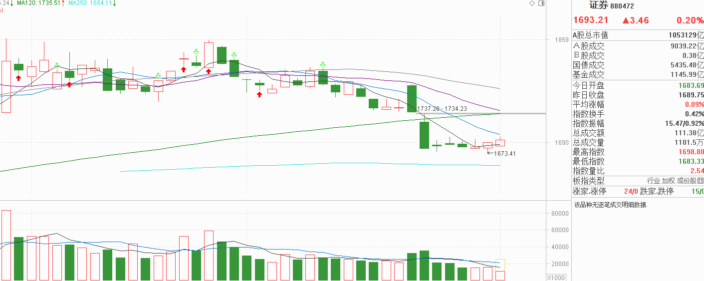 咱们的证券,上周五探底回升小阳反弹,收在了5天线上方。要知道上周五天窄幅震荡,5天线自然是走平的,抛压当然是没有了,但支撑也不算大,主要原因是这五天来没有看到有力度的阳线出现,资金流入力度基本没有。今天低开高走小阳反弹依然未能收复10天线,上方20天线、60天线也是下拐的,证券要走强,总不能蹲在5天线窄幅震荡就实现了吧?可以这样说,11月20日至21日连续两根有力度的中阴调整就是资金流出的信号,至今仅是弱修复走L型震荡,趋势也没有发生变化,还不能排除下跌中继的可能。什么时候看到有力度的中阳反弹,也仅是化解下跌中继风险而已,现在的小阳甚至是冲高回落的波动,我认为证券方向依然不能乐观,主力资金不流入我的观点也是不动,不参与证券看似企稳的超跌反弹。