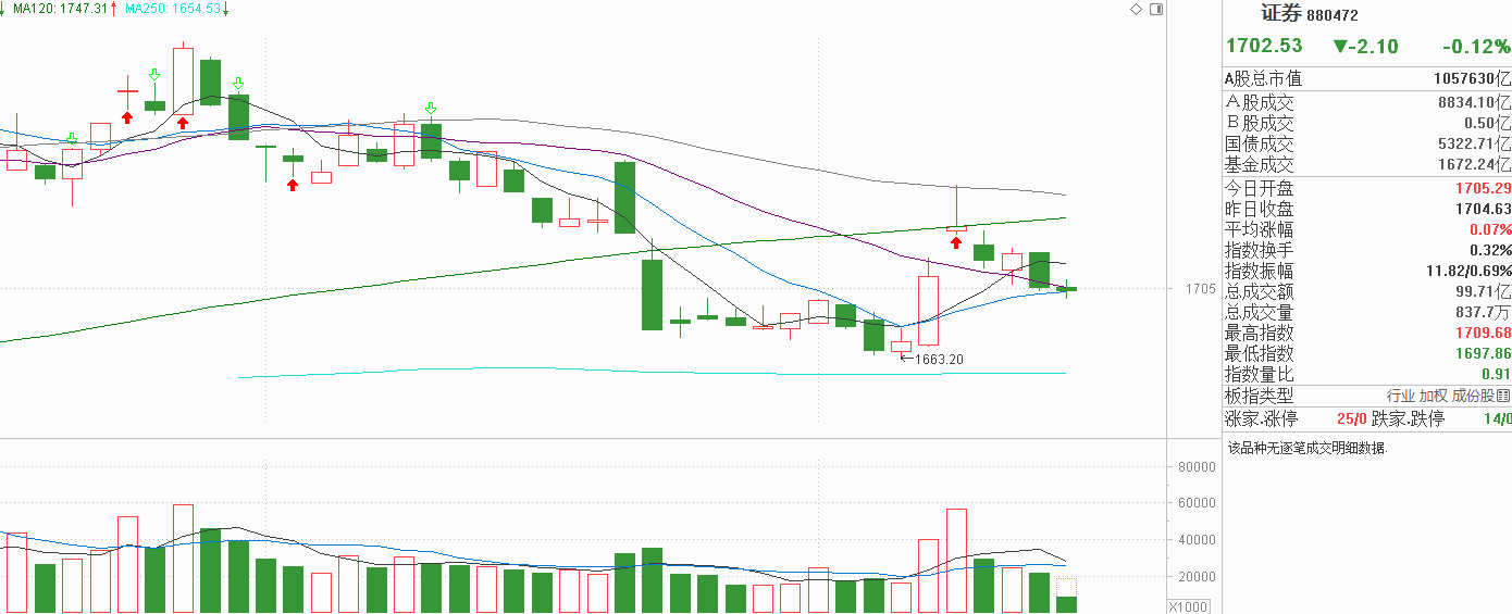 看看证券!昨天小阴调整把周三探底回升小阳线彻底反包,代表市场抛压继续释放能量,今天证券在20天线压力影响下窄幅震荡,说白了就是没有承接的表现。可以看到12月5日证券中阳反弹后没有延续性,只看震荡市是没有毛病的,现在可以确认60天线有阻力,中阳启动前是平台,只要在这个区间内波动,其实可以是没有方向的。从节奏看,证券在冲高60天线后阴跌,是箱顶往箱底走的周期,现在离箱底还有一定距离,客观上我认为证券未把抛压消化干净,更偏向继续往下探找支撑才是正常的,出现小阳反包昨天阴线是少概率事情,更别说出现中阳线突破60天线形成新的上涨行情了。震荡市周期如果要看好证券,除非回到箱底,可回到箱底又代表12月5号的中阳线是无效的,即证券要走强,就必须要走弱,走弱后容易继续下行。