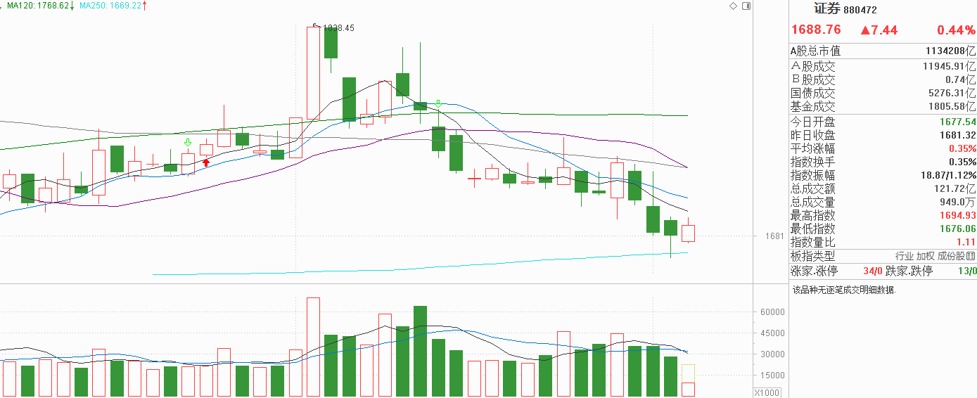 证券昨天高开低走回探年线后反弹,下影线较明显,代表年线附近有支撑,但昨天全市场普涨,证券连上涨也做不动,这种下影线其实没多大意义,并不会改变当下趋势:下跌。今天证券低开高走小阳反弹,但没有把昨天的假阴线反包,5天线也没有收复,连续下跌三天后出现修复我认为是很正常的事情,不能作为一个拐点信号出现。证券近期明确是下行趋势,而且波动比较大,像上周五那样上午反弹下午跳水也不是没有出现过,因此对于证券今天的回升,我觉得不用在意,他真的资金流入就会表现出强势,没有强势表现就别指望出现拐点,即下跌趋势延续,继续看淡比较安全。