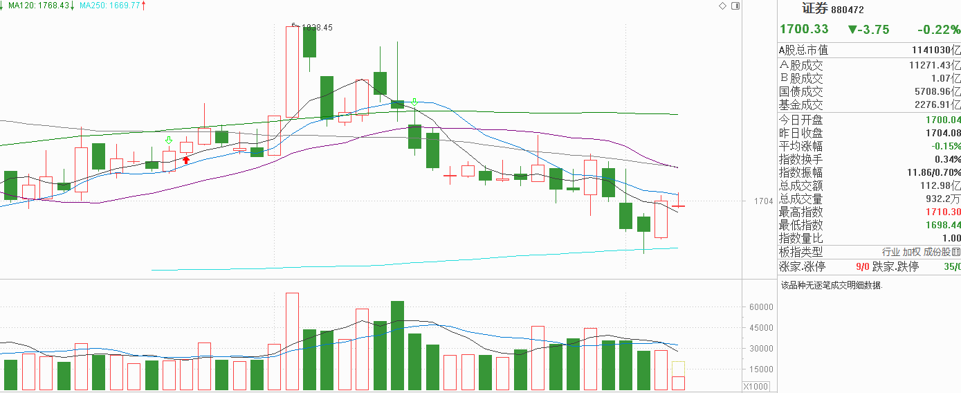 证券昨天低开高走小阳反包周一和周二的阴线,看起来出现做多动力了,但要注意证券位置仅在年线上方,5天线、10天线依然是下行的。如果无法收复这两个短线阻力,证券更像是下跌趋势的反抽而不是反弹拐点。今天证券在昨天小阳线上方窄幅震荡,并没有收复10天线,5天线虽然站上了但5天线本身还在下行,并不会产生支撑力度,从位置看,证券今天虽然没有回落,但还在1月30号阴线的下方,如果就以这么弱的反抽力度,我觉得很难继续上行。往大里说,证券现在的震荡区间是年线与半年线范围,当下位置偏低但做多信号不够强烈,主力也不敢说年线一定就是有效支撑,做价差也得谨慎。