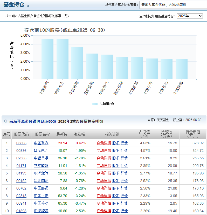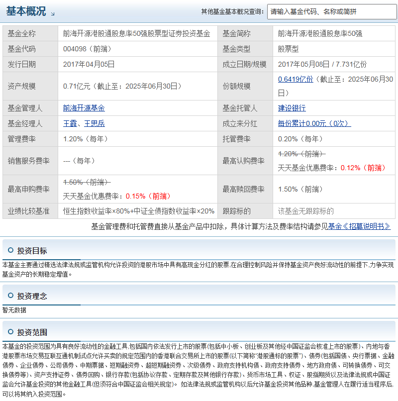 前海开源港股通股息率50强(004098)是由前海开源基金管理有限公司管理的一只股票型基金。截至2025年9月30日,它的单位净值是1.2500,基金涨幅为0.5700%,近一季累计收益率为12.83% 。而且在2025年上半年,该基金利润达到了834.94万元。