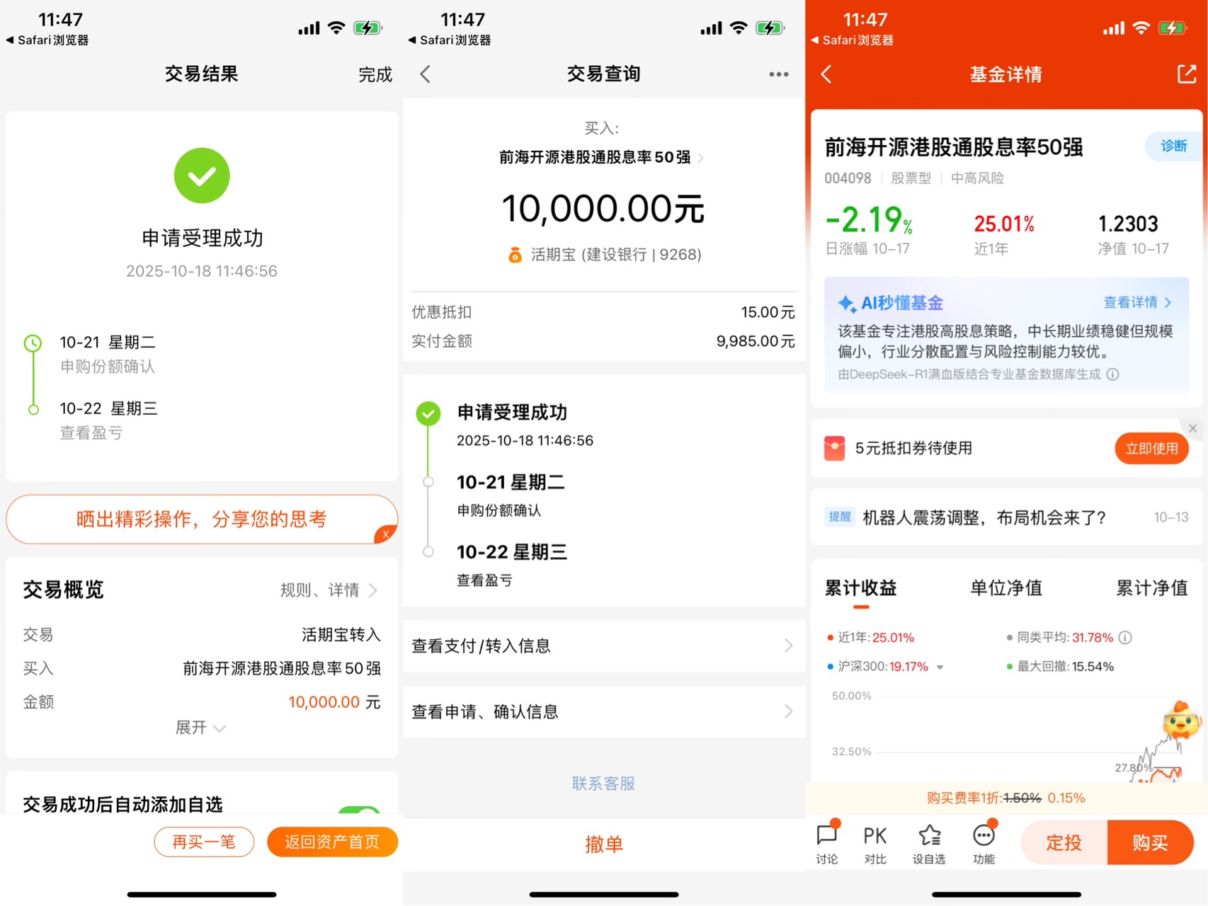 前海开源基金持有者来报道了!特别开心,又能来参与我最喜欢的前海开源基金公司举办的活动了!作为铁粉和坚定的持有者,这个活动我是一定要来参与的!与前海开源基金结缘差不多有几年的时间了,现在持有前海开源沪深300指数基金、前海开源沪港深裕鑫基金。这段时间我正在观察前海开源港股通股息率50强基金,也打算开始入手布局!正好今天来参与活动,择日不如撞日,干脆我今天就直接入手了!这款产品确实挺有特点的,也特别符合我的择基标准,所以,直接拿下!正好也借着今天这个机会,我来好好聊聊我对红利策略的看法!下面,咱们就开始正题: