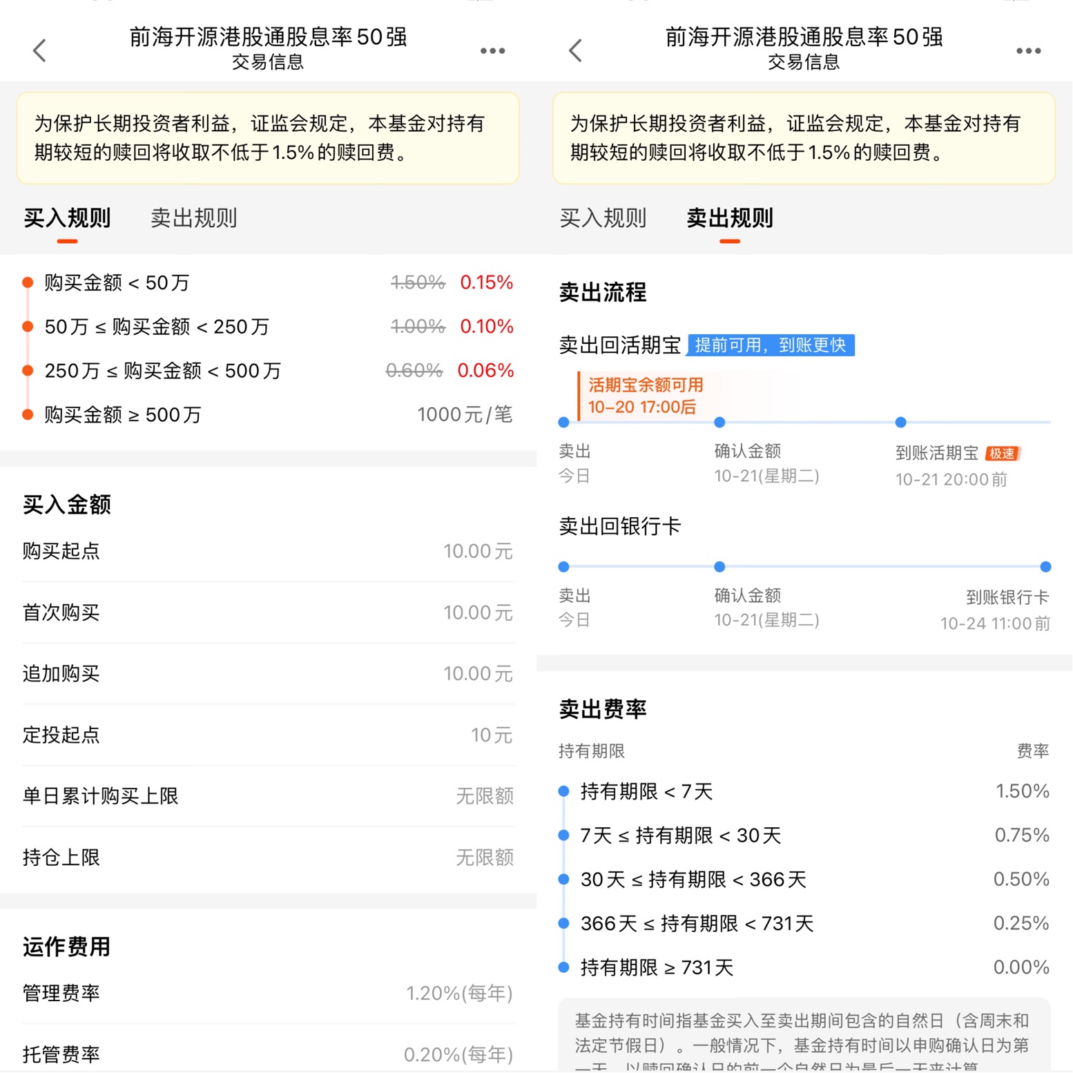 交易规则这块,买入费率挺优惠的,买1折后才0.15%(金额<50万时),50万到250万是0.10%,250万到500万是0.06%,500万以上1000元/笔,起点也低,10块钱就能买,定投也很方便。