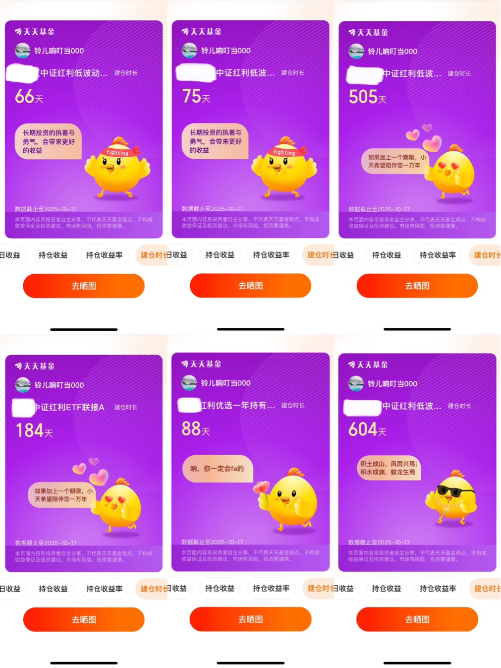 再聊聊基金三,建仓505天,快一年半了。这么长时间的陪伴,让我对它的感情格外不一样。从最初的试探性建仓,到后来看着它在市场波动中稳稳前行,我越来越坚信红利策略的价值。“如果加上一个期限,小天希望陪伴您一万年”,这话虽然是基金平台的调侃,但放在它身上,我真的希望能和它长长久久。它就像个忠诚的老友,不管市场是牛市狂欢还是熊市低迷,都在那里不离不弃,用实实在在的表现告诉我,选红利策略,选对了。