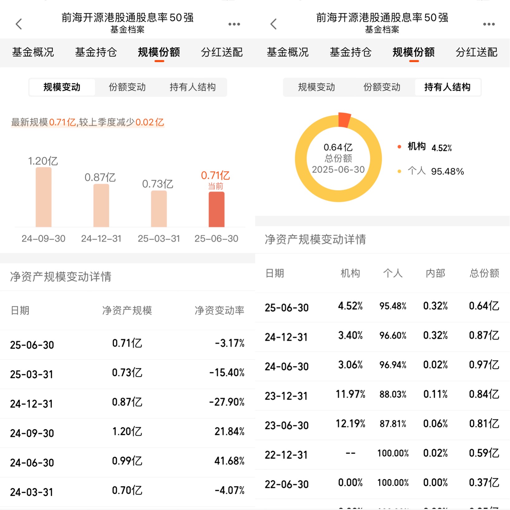 这只基金最新规模0.71亿,不算大,属于“迷你基”范畴。规模小有利有弊,好处是基金经理操作起来比较灵活,调仓方便;坏处是可能面临流动性风险,不过它的持有人结构里个人投资者占95.48%,机构占4.52%,而且规模虽然近期有所下降,但整体还算稳定,所以流动性问题不用太担心。