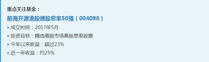我重点关注的前海开源港股通股息率50强基金就是专门投资这类资产的。这只基金成立于2017年5月,主要投资于港股市场中股息率较高的50只股票。从业绩表现来看,今年以来收益率超过23%,近一年收益达到25%左右,表现相当不错。更重要的是,这只基金的投资策略很清晰,就是精选那些分红稳定、估值合理的优质公司。