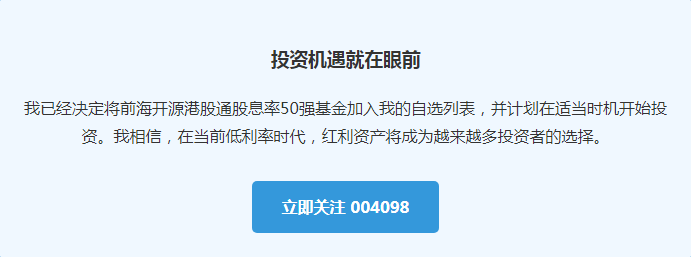投资是一场马拉松,需要耐心和坚持。红利资产可能不会让投资者一夜暴富,但能够提供稳定的现金流和相对稳健的收益。在这个充满不确定性的时代,这样的投资品种显得尤为珍贵。我已经准备好迎接这个投资新机遇,你呢?$前海开源港股通股息率50强(OTCFUND|004098)$