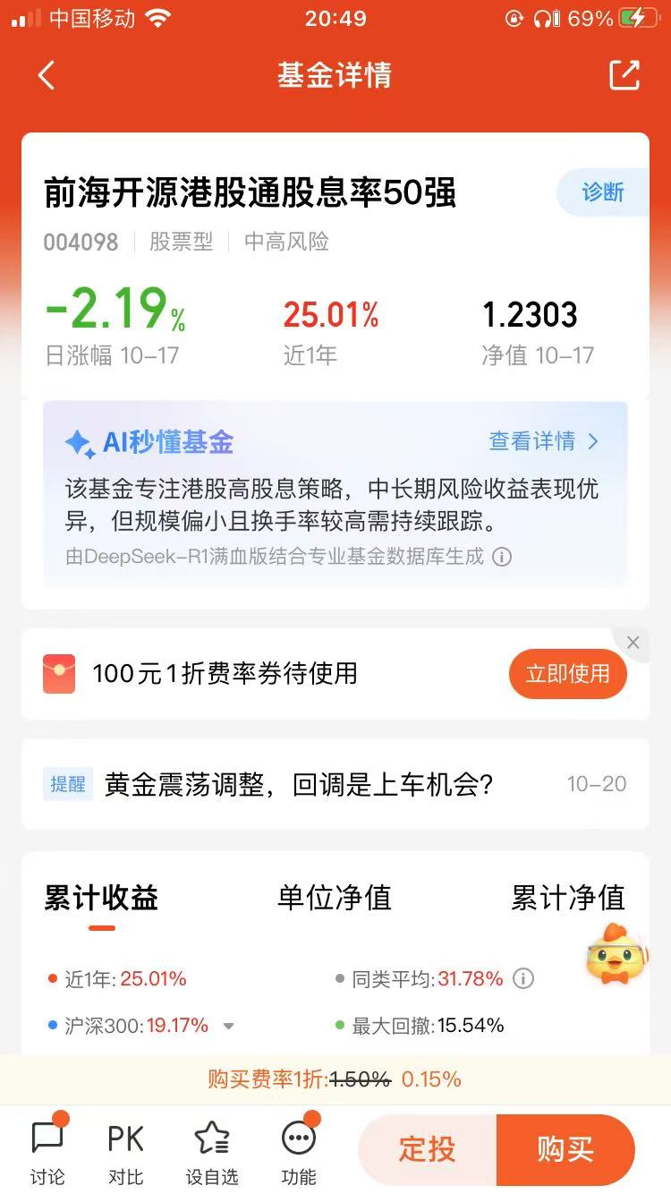 如果要选这只基金,我觉得得想清楚自己能不能扛住港股的波动。要是能接受短期回撤大,又想拿高股息,而且手里没有太多港股资产,配置一点没问题;但要是追求稳,还是 A 股的红利低波基金更合适。我自己没买这只,主要是觉得手里已经有 A 股红利基金了,再买港股的,风险有点重叠,还不如留着仓位看看其他板块的机会。@前海开源基金