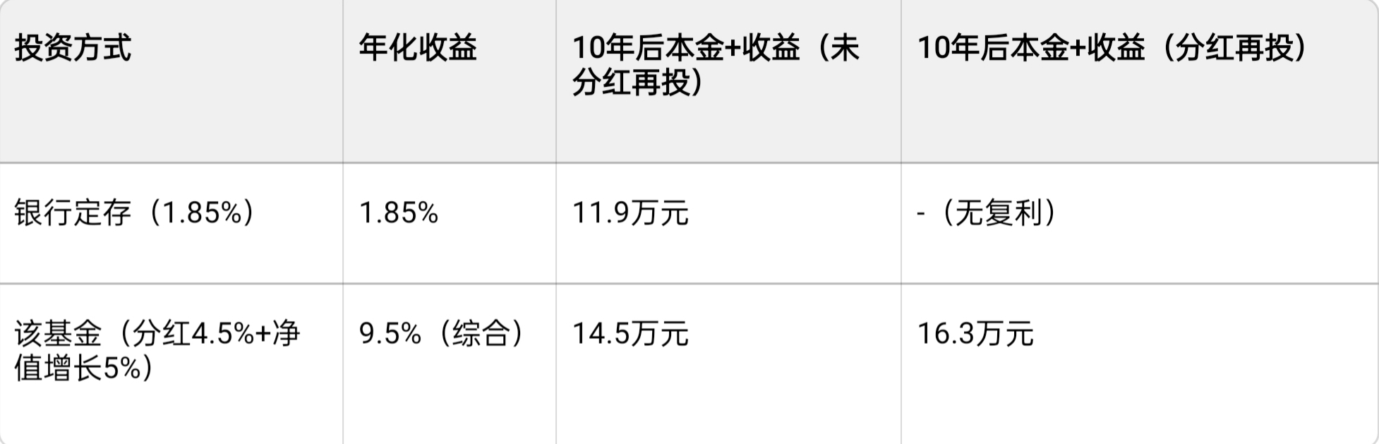 投入10万,分红再投10年能比银行多赚4.4万,这就是“时间的钱”。
