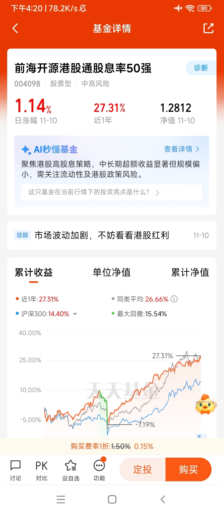 之所以对这只基金情有独钟,核心原因在于它精准踩中了我对优质红利资产的所有期待。作为聚焦港股红利的专项产品,它直击港股当前的核心优势——低估值+高分红,精选50家基本面扎实、股息率突出的优质企业,相当于用合理成本握住了一批价值被低估的“现金奶牛”。更让我心动的是它实打实的业绩表现,近一年涨超26%的成绩,既印证了港股红利资产的上涨潜力,也彰显了基金经理在选股和仓位管理上的专业实力,打破了“港股波动大就难赚钱”的刻板印象。