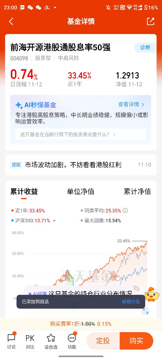 从业绩表现来看,前海开源港股通股息率50强基金用数据证明了其投资价值。截至2025年11月12日,基金最新净值为1.2913,近1个月涨幅2.59%,近3个月上涨7.78%,近6个月和近12个月涨幅更是分别达到24.62%和29.08%,在震荡市中展现出强劲的盈利能力。更值得关注的是其风险控制能力,近三年最大回撤显著优于同类基金,夏普比率0.57,风险调整后收益优于86%的同类产品,实现了“波动有价”的投资目标。在2024年港股市场调整期间,该基金仍取得15.57%的年度收益,为投资者提供了难得的“安全感”,这正是其精准选股与科学配置的直接体现。