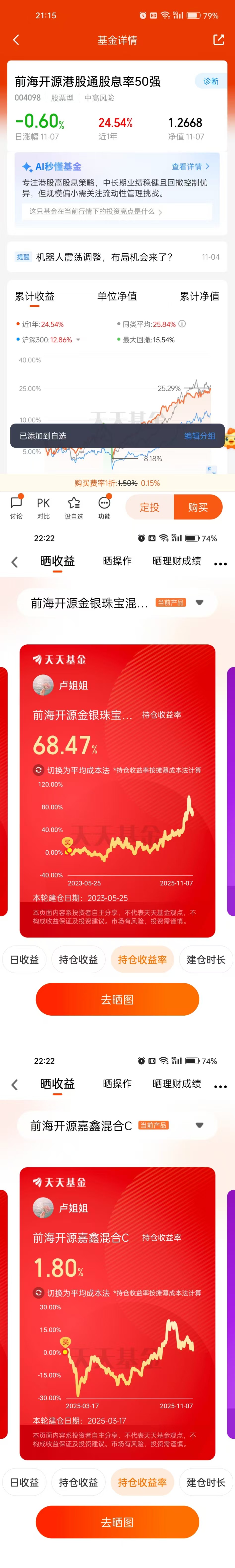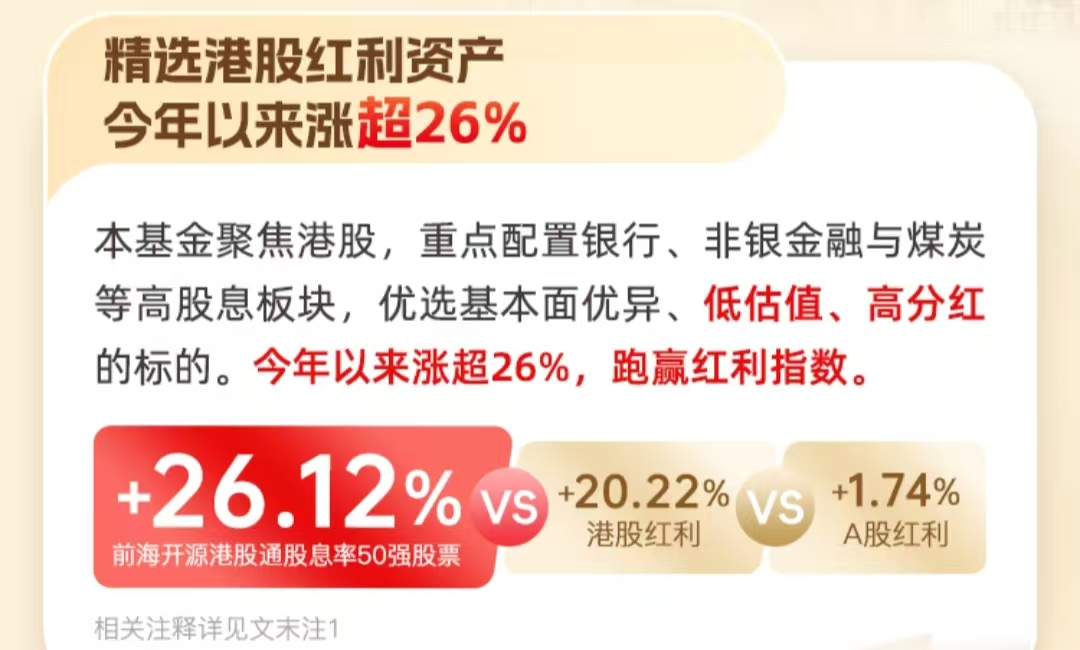 $前海开源港股通股息率50强(OTCFUND|004098)$布局港股红利,首选基本面优异、低估值、高分红的股票,基金经理前海开源执行投资总监王霞,同行翘楚,擅长择时,善于自上而下把握行业轮动机遇;另一名王思岳,海归派,擅于把握上游原材料及宏观大周期投资机会;两位基金经理主动管理能力超强,近2年收益高达51.61%,较同期业绩基准斩获超22.07%的超额收益;基于不错的表现,在过去的最艰难三年时光中该基金表现全部“优秀”,同行领跑。站在资产配置的角度去看,买这只基金真的是静水流深,穿越低谷好标的,我打算长期拿着当底仓配置!