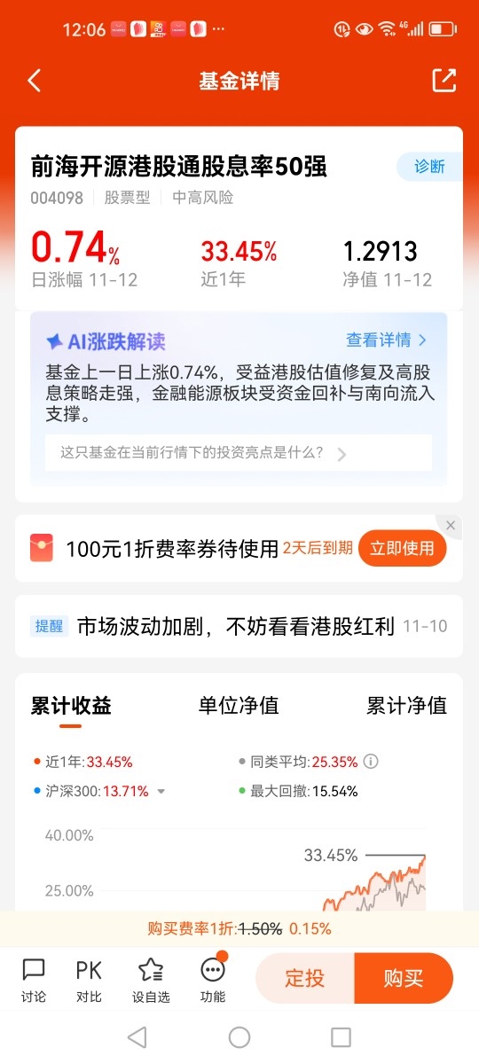 $前海开源港股通股息率50强(004098)$聚焦港股,重点配置银行、非银金融与煤炭等高股息板块,优选基本面优异、低估值、高分红的标的。数据显示,该基金近5年、近3年、近2年收益率分别为39.93%、50.24%、51.61%,业绩表现优秀。从近5、近3、近1年特色数据来看,基金波动很小、回撤较小;夏普比率分别为0.28、0.71、1.88,性价比很高。而且该基金近1月、近1周收益分别为3.35%、2.95%,这在近期震荡加剧的市场中表现优异。截止目前,今年以来涨幅高达29.27%,大幅跑赢中证红利指数3.67%的涨幅。