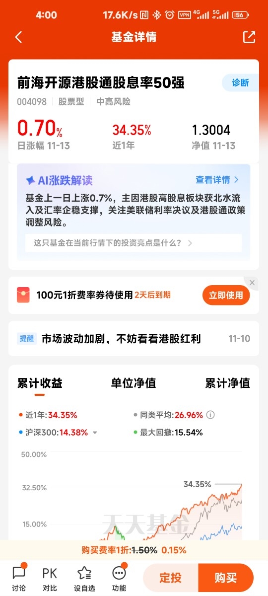 前海开源港股通股息率50强,就是专挑那些港股里股息高、派息稳定的公司投资。选它的理由很直接:一是港股很多蓝筹公司、老牌企业,盈利稳、现金流好,发得起股息;二是基金帮你挑了50只,分散风险,不用自己一个个找,省心省力;三是高股息率意味着每年的现金回报不错,可以再投资或当做固定收益补充。