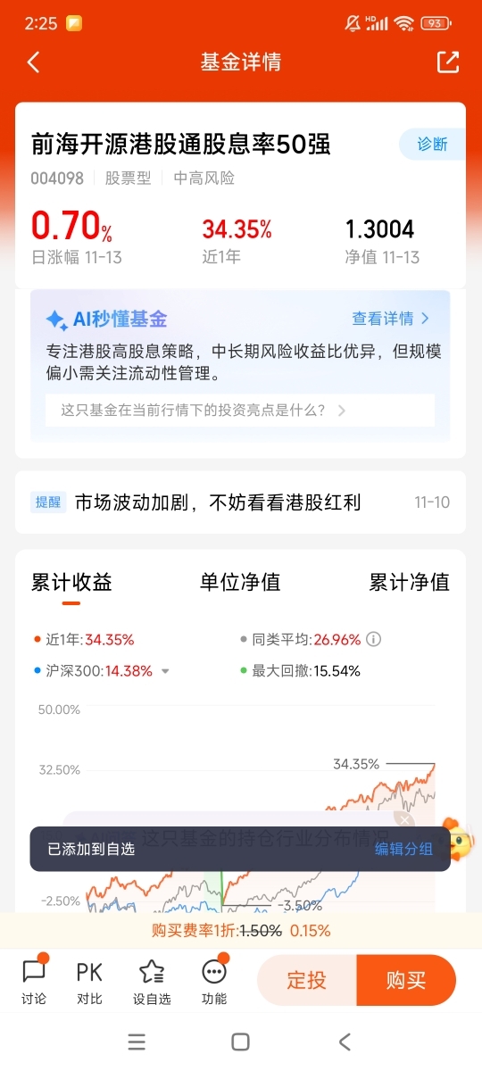 我已经将红利资产作为我投资组合的一个重要组成部分,目前的持仓占比维持在四分之一。我们所处的宏观环境正在发生深刻变化,无风险利率持续走低,寻找能够提供稳定现金流的资产变得愈发困难。此时,红利策略的优势就凸显出来了。我对于“红利”的看法是,它代表了一种“确定性”优先的投资哲学。高股息公司通常是行业内的佼佼者,拥有强大的现金流和健康的资产负债表,持续的分红记录本身就是公司质地优良的证明。这种基本面特征使得它们在市场下跌时跌幅相对较小,展现出“抗跌”属性;而在市场上涨时,其价值也更容易被重新发现,从而实现“能涨”。我之所以看好前海开源港股通股息率50强这类产品,是因为它将红利策略的应用场景拓展到了港股市场。港股市场拥有大量业务根基在内地、但估值却更具吸引力的公司,这为高股息策略提供了肥沃的土壤。该基金通过量化方法精选股息率最高的50家公司,构建了一个高息组合,这不仅有望获得可观的分红收入,也包含了未来估值修复带来的资本利得潜力。在我看来,它是普通投资者参与港股高息投资、优化资产配置的一个较为省心且高效的选择。股息率高的股票,通常意味着其现金流较好,而如果能连续分红,则进一步表明这家企业的基本面较好。这类股票有时因为高分红的特性,能够让投资者充分抵御其自身价格下跌所带来的损失,出现那种一段时间里股价下跌,但由于分红收益,投资者实质上赚钱的效应。从行业分布(按权重)上看,该指数囊括最多的股票来自金融和材料行业以及工业等成熟行业,银行、化工等企业众多,整体上行业分布较分散,也意味着抗风险能力较强。