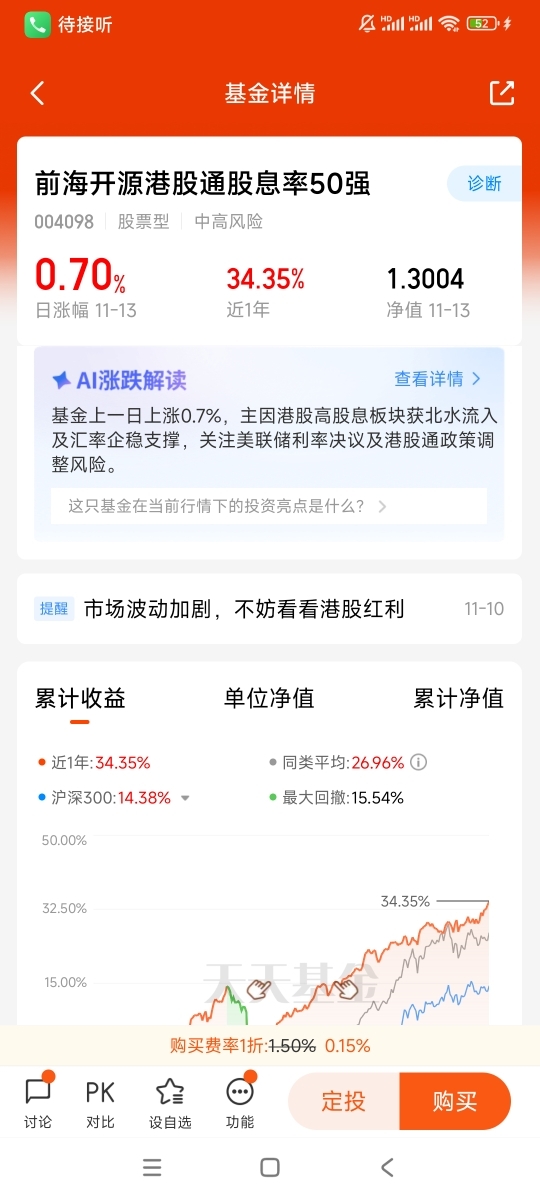 看好$前海开源港股通股息率50强$ 的投资前景,红利主要聚焦于具有稳定持续大比例分红能力的公司,这些公司大多为盈利稳定,现金流充裕,估值低,红利策略具有防御属性的优势,收益稳健安全边际高,红利投资一直以来都是权益投资的重要方向,也是成熟市场实现资本回报的主要路径。当前时点,不论是从波动率、估值还是政策来看,红利策略基金都是一个较优选择。