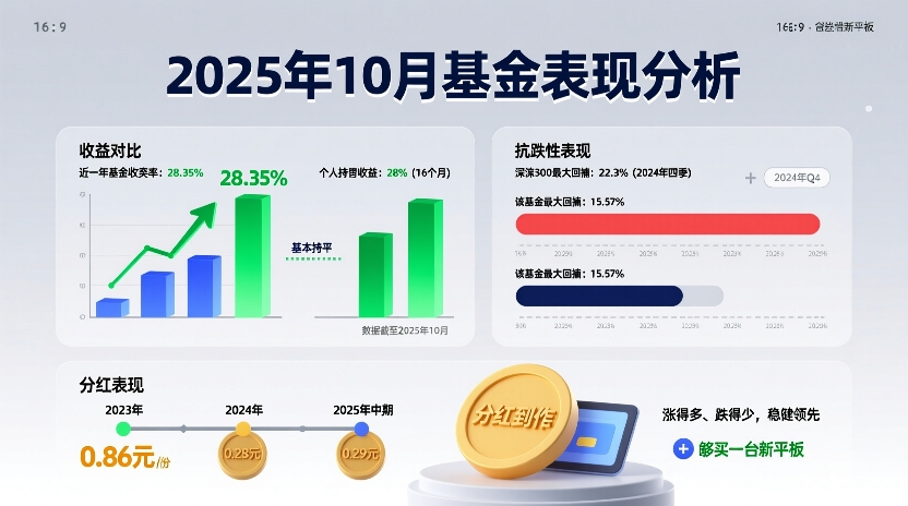 截至2025年10月,这只基金近一年收益28.35%,和我自己16个月28%的持仓收益基本持平,对新手来说已经超满足了 。更惊艳的是它的抗跌性:2024年四季度港股回调时,沪深300最大回撤22.3%,这只基金才15.57%,真正做到“涨得多、跌得少”。而且分红从不缺席,近三年累计分红0.86元/份,2025年中期分红到账时,正好够我买一台新平板,这种“躺赚零花钱”的感觉,比升职加薪还开心。