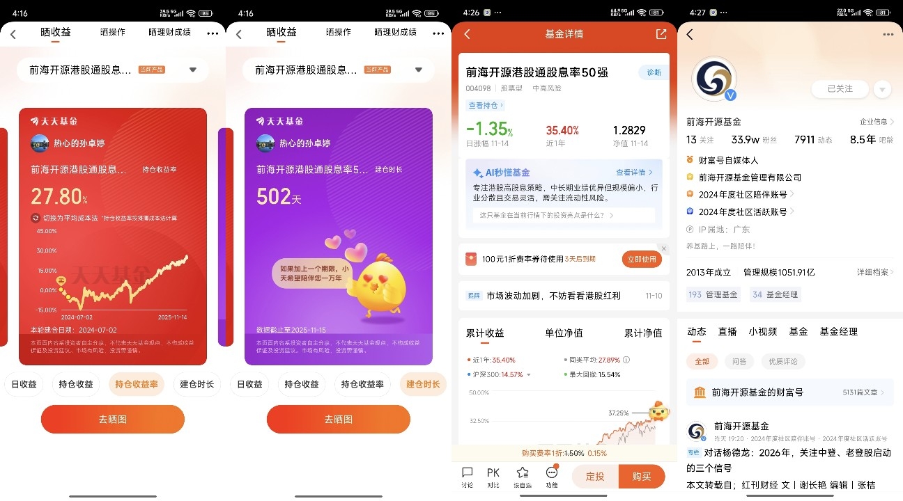 24年7月刚毕业领第一笔工资买入,9月加仓,到25年11月正好16个月,收益稳稳落在28% 作为职场新人,这只前海开源港股通股息率50强(004098)不仅让我赚到了房租外的“额外收入”,更让我在迷茫的理财初期,摸到了“长期持有+选对赛道”的财富密码。