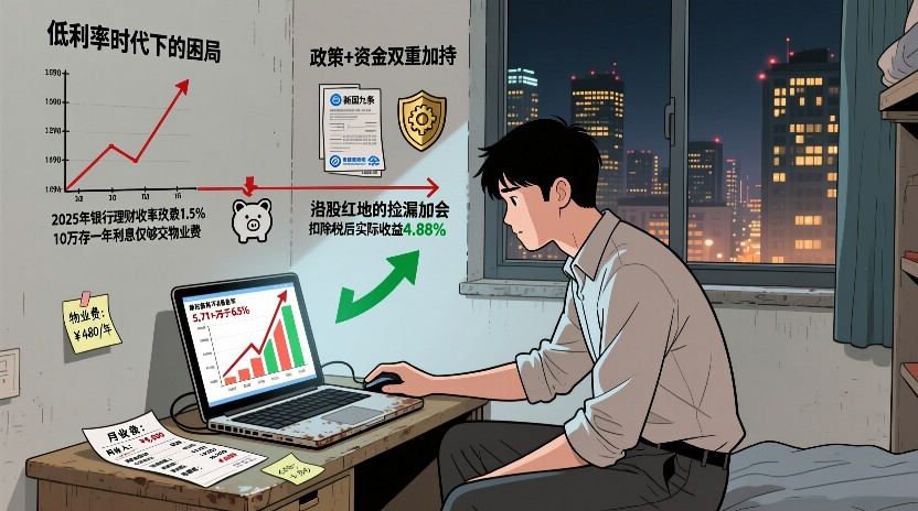 刚毕业时,我揣着每月扣完房租只剩几千块的工资,既怕追科技股被割韭菜,又不甘心让钱躺在银行吃1.3%的定存利息(10万存一年利息刚够交物业费)。选择港股红利赛道,完全是新手的“求生式选择”,却意外踩中了时代风口: