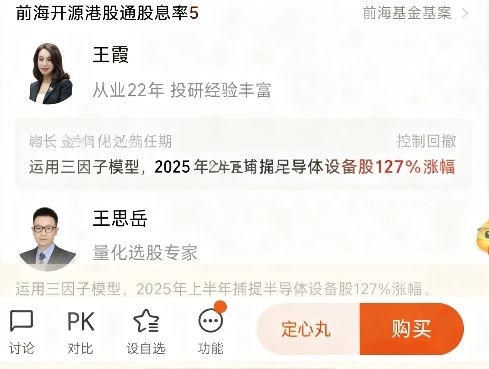 这只基金由王霞和王思岳两位经理共同管理,简直是为新手量身定制的“定心丸”!王霞有22年投研经验,最擅长控制回撤——2024年9月港股回调时,很多同类基金回撤超25%,但这只基金最大回撤才18.7%,正因为看到它“跌得少、抗造”,我才敢把当月奖金全部加仓 。而王思岳作为量化选股专家,能用“市值-股息率-现金流”三因子模型筛出真正的优质标的,2025年上半年还捕捉到某半导体设备股127%的涨幅,让基金在稳健中不失弹性,不会错过市场机会。