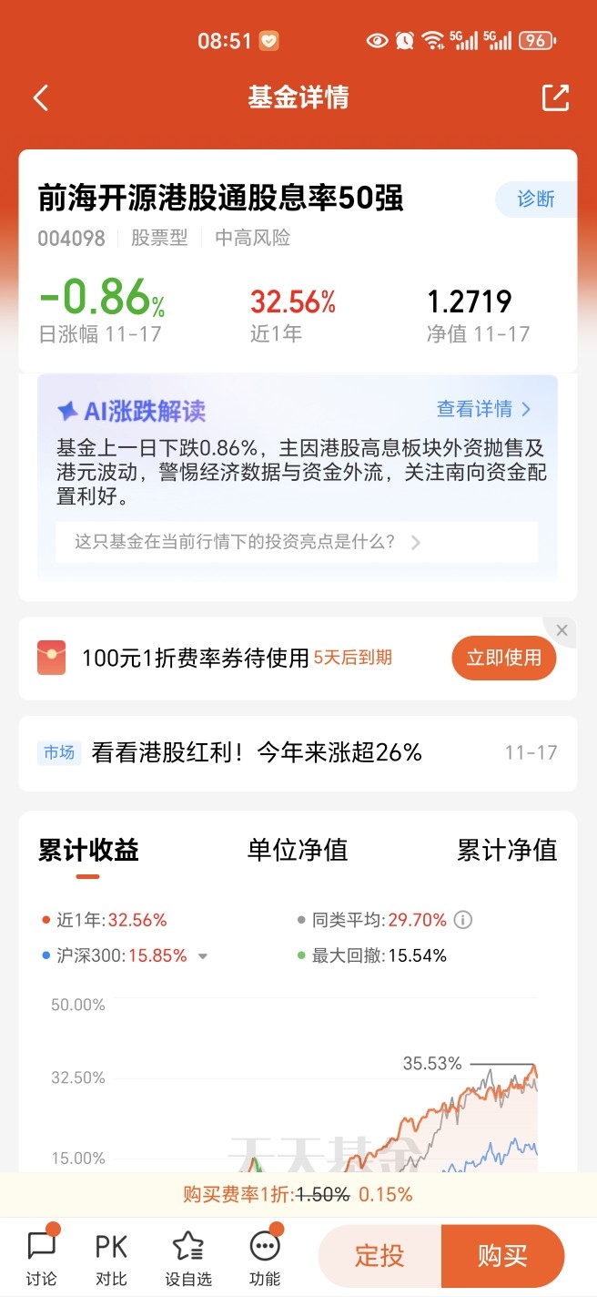 4. 短期存波动风险,或影响阶段性表现 :该基金股票资产占比不低于80%,且聚焦港股通标的,而港股易受美联储政策调整、国际资本流动等外部因素影响。像11月17日基金就出现0.86%的日跌幅,未来若海外利率波动、港股市场突发回调,可能会导致基金短期净值波动,对短期持有体验带来一定影响。