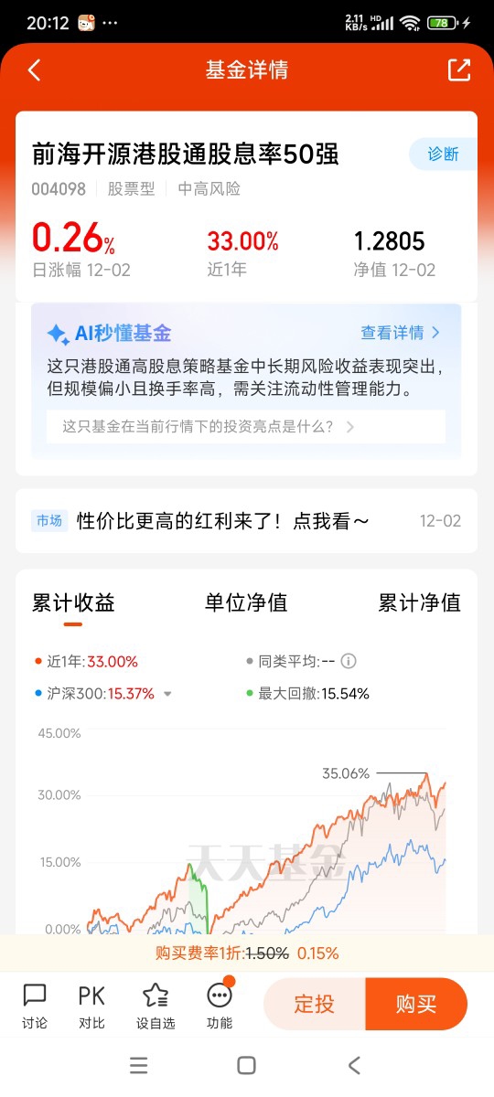 【前海开源港股通股息率50强 004098】近一年收益率33%,我先加个自选,择机再上车。