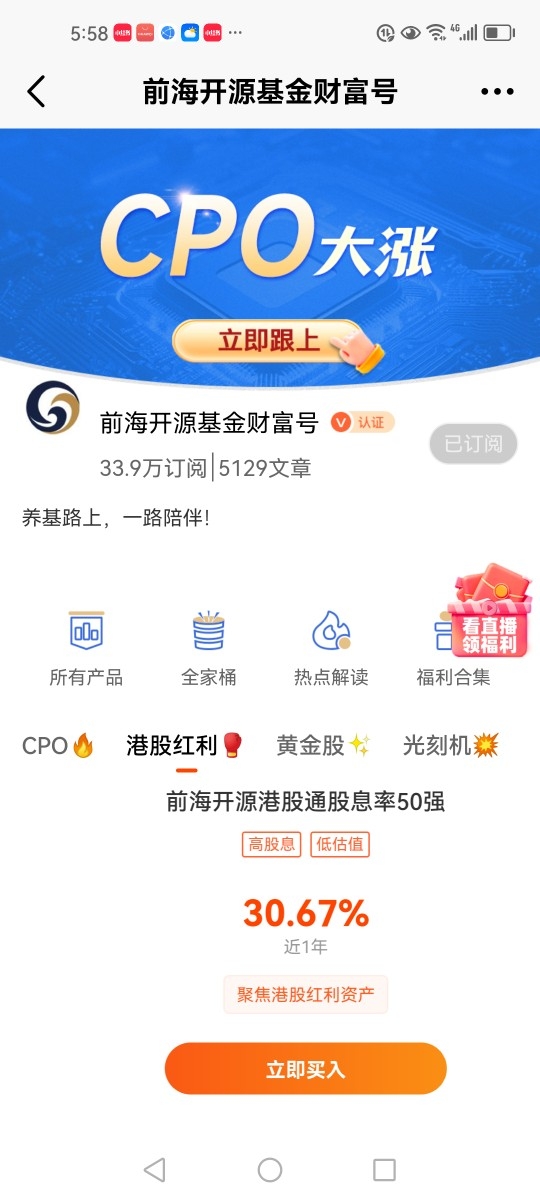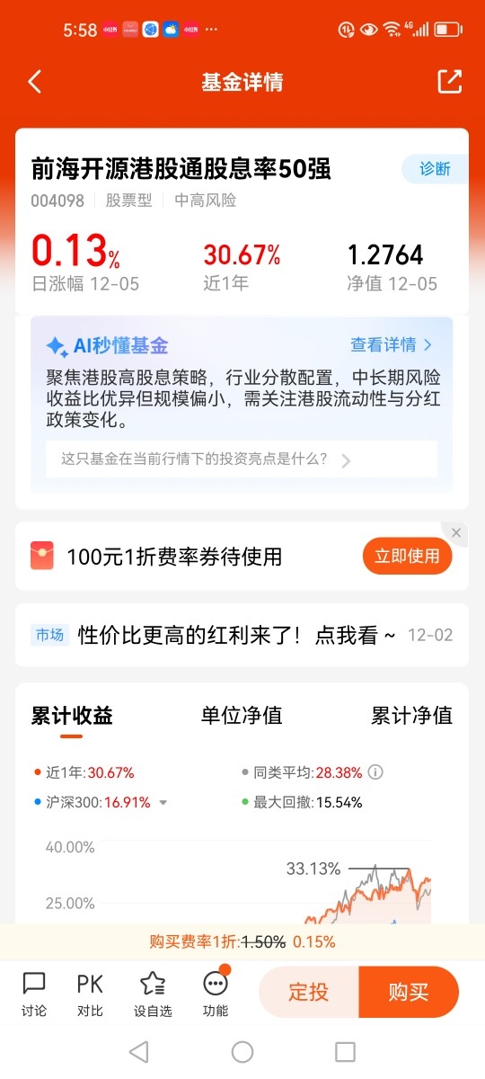 $前海开源港股通股息率50强(004098)$聚焦港股,重点配置银行、非银金融与煤炭等高股息板块,优选基本面优异、低估值、高分红的标的。该基金近1月收益1.76%,同类排行前15%(146/1052),这在近期震荡加剧的市场中表现优异。截止目前,今年以来涨幅高达27.78%,大幅跑赢中证红利指数-0.42%的涨幅。