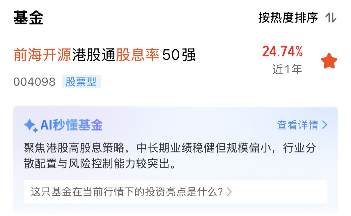 我最近重点关注的是——前海开源港股通股息率50强股票基金(基金代码:004098)。选择它,我主要基于两点考虑: