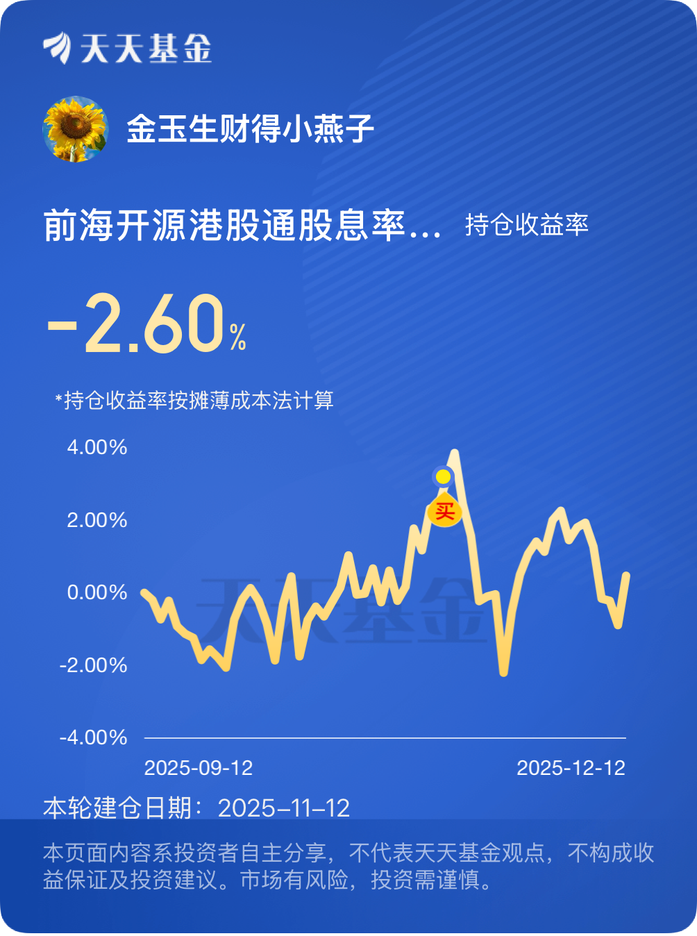 最后,说点心里话。市场永远像一条奔流不息的河,风格轮动是常态。从热炒高成长的科技股,到拥抱稳健分红的红利资产;从追逐短期的高弹性,到重视长期可预期的确定性收益,我的投资思路也在这个过程中不断学习、调整和进化。新“国九条”从制度层面重塑了A股的分红生态,为红利投资奠定了坚实的政策基础;无风险利率的持续走低,让“安全收益”变得愈发珍贵;而经济弱复苏的大背景下,央国企等核心红利资产分红的稳定性,更显得难能可贵。红利资产,尤其是那些经过专业、主动管理筛选出来的优质红利资产,在当前这个时点,确实展现出了它独特的、不可替代的配置价值。当然,天下没有免费的午餐,高股息背后也可能隐藏着陷阱。只有保持警惕,借助专业机构的力量深入研究、精挑细选,才能更稳地走好红利投资这条路。投资终究是一场长跑,找到真正适合自己的、能让人晚上“睡得着觉”的资产,或许比什么都重要。红利这条路,我选择继续走下去,边走边看,边学边调整。#晒收益#