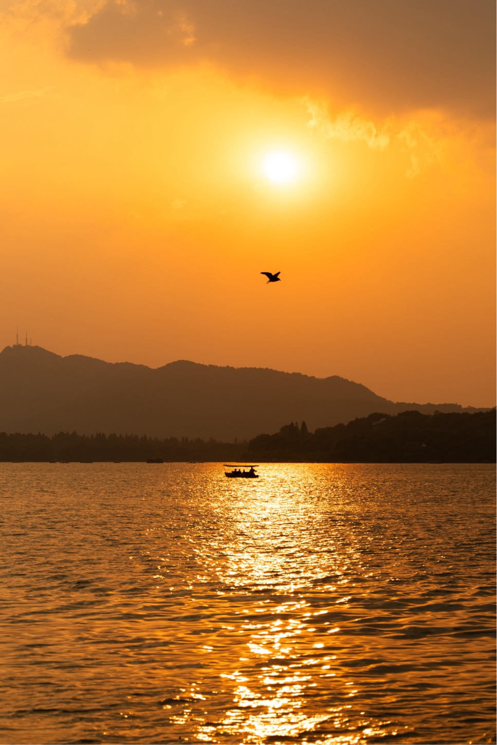 不知不觉,日头西斜。我知道,重头戏要来了。早早寻了一处面向西边的湖边长椅坐下,也许是“柳浪闻莺”附近开阔的水岸,也许是“雷峰夕照”对岸的某个角落。耳机里的音乐换成了舒缓的纯音,静静地等待。天空的色彩开始变得无比丰富,从耀眼的金黄,到浓郁的橘红,再到温柔的粉紫,一层层晕染开来,像打翻的调色盘,瑰丽得令人屏息。那轮巨大的红日,缓缓地、庄严地,向着远山、向着湖面沉落。余晖毫无保留地泼洒在湖水上,铺就一条金光大道,直直地通向天边,也仿佛照进了心里。落日的壮美带着一种难以言喻的抚慰力量,让人忘却时间,忘却琐碎,只想把这天地间的盛景深深印刻在脑海里。此刻,天地辽阔,只有我,只有这湖,只有这绚烂的落幕。所有的疲惫,都在这一刻被彻底净化,只剩下内心的澄澈与安宁。