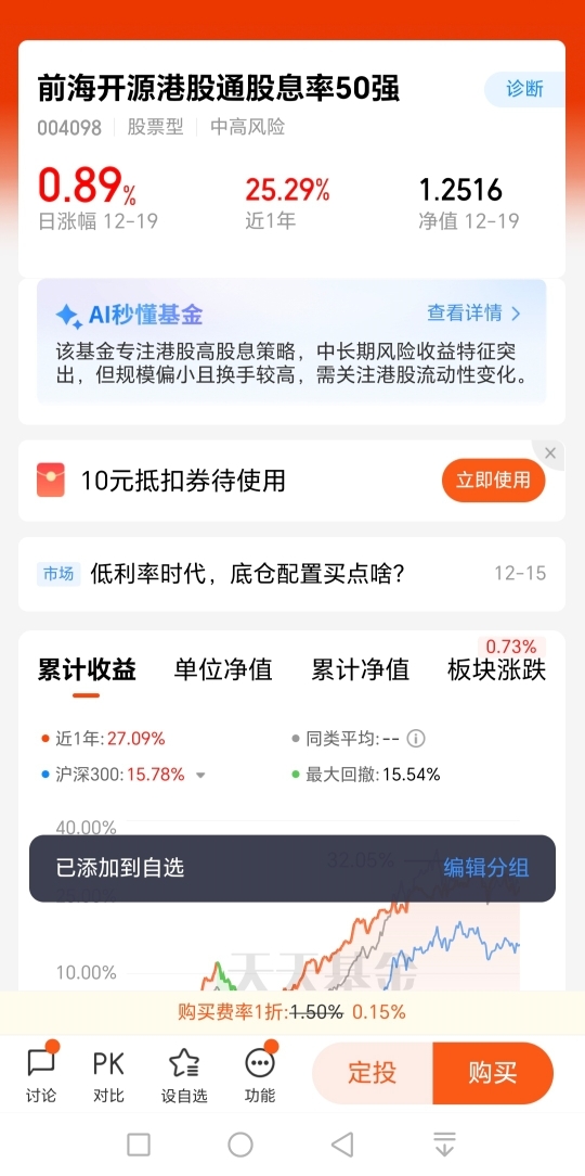 前海开源港股通股息率50强(004098)是聚焦港股高股息资产的中高风险股票型基金,成立于2017年5月。其核心亮点是精选连续分红企业,持仓平均股息率达7.2%,覆盖金融、能源等防御性行业,前十大重仓股占比32.74%,分散度较好。
