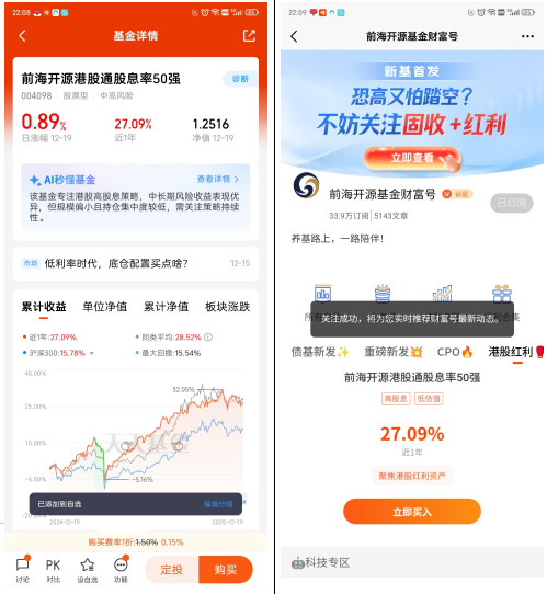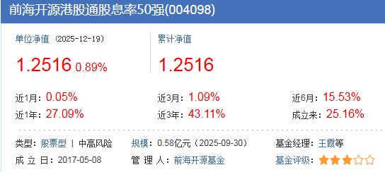 #前海开源红利家族#我pick$前海开源港股通股息率50强(OTCFUND|004098)$ 。在低利率环境下,能涨抗跌的“红利资产”正成为资本市场的新宠。作为聚焦港股高股息的代表性产品,前海开源港股通股息率50强基金(OTCFUND|004098)凭借“高股息+低估值”的双重策略,近一年实现超25%的收益率,成为投资者布局港股红利的优选工具。
