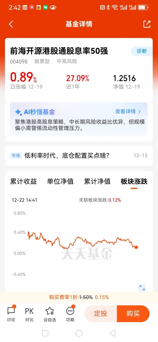 $前海开源港股通股息率50强$ 是追踪香港股市中高股息率股票表现的基金,主要筛选分红稳定、股息率较高的港股成分股编制而成,整体逻辑与我们持有的红利低波一致,区别是市场不同。